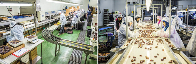In de verwerking van de dadels zijn ongeveer 20 mensen werkzaam, ook hier Palestijnen en Israëliers. Onze biologische dadels Medjoul zijn een mooi voorbeeld van samenwerking tussen mensen met een verschillende achtergrond die losgekoppeld is van politiek. Dit is dan ook de reden dat wij voor dit project hebben gekozen. Lokale werkgelegenheid, zorg voor de natuur en samenwerking tussen mensen staat centraal in de teelt en verwerking van bijzonder mooie biologische dadels.